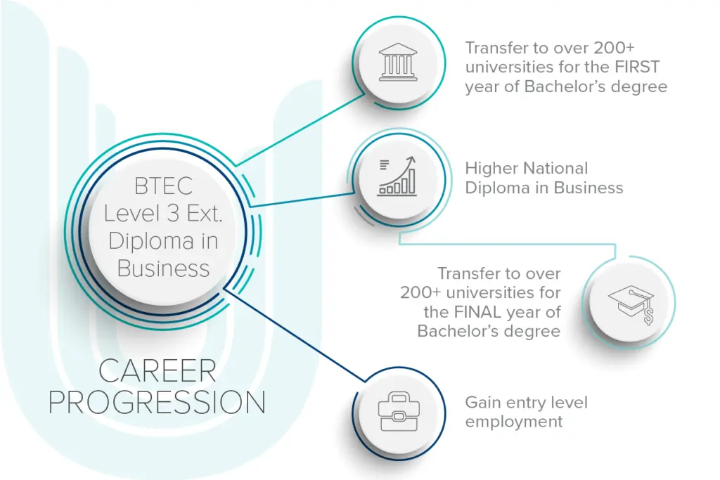 BTEC Level 3 Ext. Diploma in Business provides pathway towards a rewarding career, with options to transfer to over 200 universities worldwide or gain employment at an entry level.
