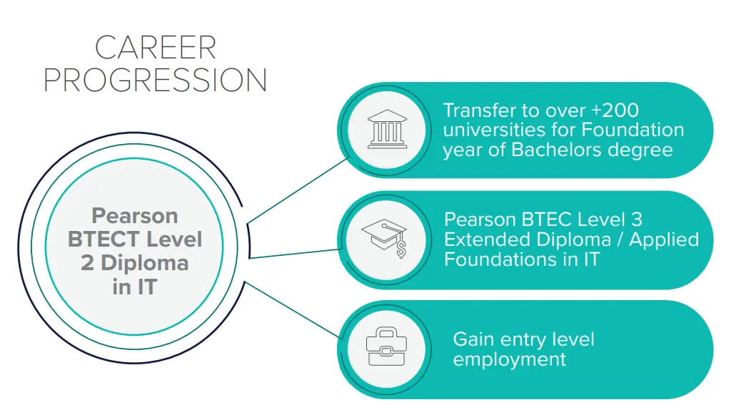 The BTEC Level 2 Diploma in Information Technology (IT) offers a practical introduction to students and professionals aspiring to pursue a career in IT. Learners explore a range of areas in IT and gain skills that prepare them for employment in the industry or progress towards additional qualifications. The diploma is awarded by Pearson, the world’s largest learning company, it is recognized by universities and organizations worldwide.